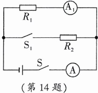 14. 如图所示,电源电压恒定,$R_1= 20\ \Omega$。当只闭合开关$S$时,电流表$A_1的示数为0.3\ A$,再闭合$S_1$时,电流表$A的示数为0.45\ A$,求: