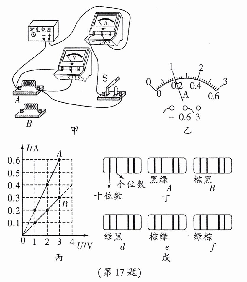 Ω。在工程技术中用不同颜色的环对电阻进行标记,阻值是两位数以内的电阻可以根据前两环的颜色来判断,色环含义及导体$A、B$的色环如图丁所示,若还需用到一个$15\ \Omega$的电阻,应选用图戊中的电阻e