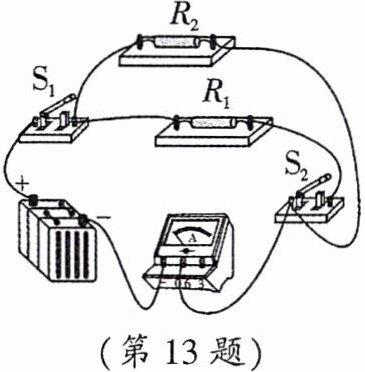 13. 如图所示的电路中,电源电压为6 V且保持不变。当只闭合开关$S_{1}$时,电流表的示数为$I_{1}$;当开关$S_{1}$、$S_{2}$均闭合时,电流表的示数为$I_{2}$,且$I_{1}:I_{2}= 1:3$,则$R_{1}:R_{2}= $