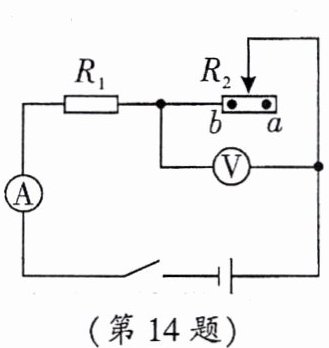 14. (2025·南开)如图所示,电源电压不变,$R_{1}$为定值电阻,$R_{2}$为滑动变阻器。闭合开关,当滑片在a、b两点间移动时,电流表示数变化范围为0.2~0.6 A,电压表示数变化范围为2~4 V,则$R_{1}$的电阻为