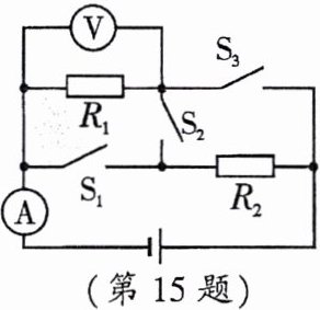 15. 如图所示的电路中,电源电压不变,$R_{2}= 30\ \Omega$。当$S_{1}$、$S_{3}$断开,$S_{2}$闭合时,电流表的示数是0.3 A,电压表的示数为3 V。求: