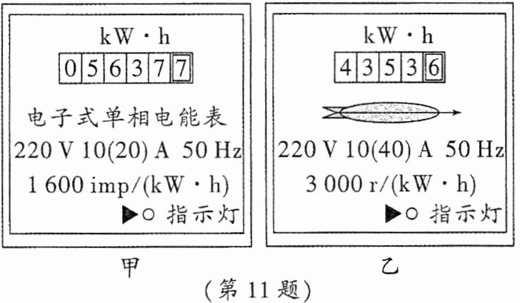 11. 小明家的电能表月初示数为5546.7 kW·h,月末电能表示数如图甲所示,若一度电按0.5元的单价计算,那么小明家本月将缴电费