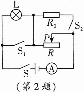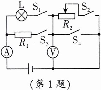 (2)只闭合$S_1$、$S_2$时,$L$与$R_2$串联,总电阻$R_{总}=R_L+R_2=12\,\Omega+8\,\Omega=20\,\Omega$,电路电流$I=\frac{U}{R_{总}}=\frac{6\,V}{20\,\Omega}=0.3\,A$,电能$W=UIt=6\,V×0.3\,A×100\,s=180\,J$。