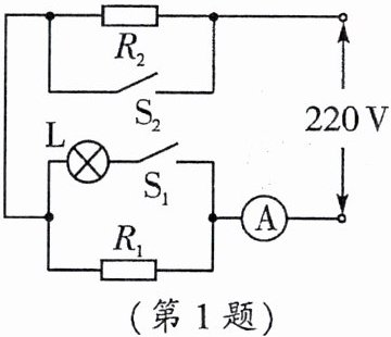 1. 冬季,养鸡场为了提高产蛋量,夜间需要在鸡舍里用电热器加热并用灯泡照明;白天只需要在鸡舍里用电热器加热,不需要用灯泡照明。小阳根据上述要求设计了一种加热照明装置,这个装置的电路图如图所示,电阻$R_1和R_2$是两个用来加热且阻值不变的电阻丝,灯$L$是标有“$220\ V\ \ 160\ W$”的照明灯泡,开关$S_1$、$S_2$的通断只有两种状态,一种是同时断开,另一种是同时闭合。该装置从早晨$7:00至17:00$处于白天工作状态,连续正常工作$10\ h$,这段时间内电流表的示数为$5.5\ A$,电阻$R_1的电功率为P_1$,电阻$R_2的电功率为P_2$,电路的总电功率为$P$;该装置从$17:00至第二天早晨7:00$处于夜间工作状态,连续正常工作$14\ h$。已知:电源两端的电压$U恒为220\ V$,$\frac{P_1}{P_2}= \frac{1}{3}$。求: