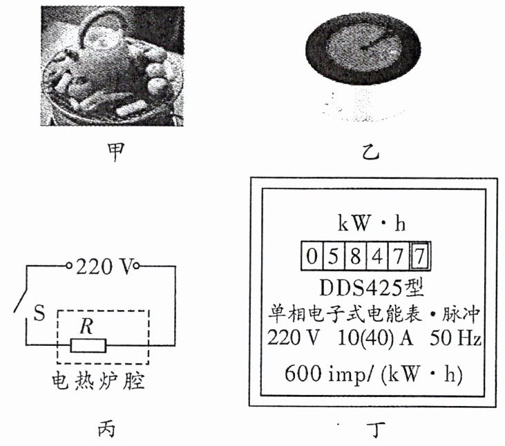 例2 “围炉煮茶”是近年人们喜爱的“国风”休闲方式之一,其中最离不开的就是土陶罐制作的小火炉(如图甲所示),考虑到安全性和环保性,不少顾客更愿意选择电陶炉(如图乙所示)。小德同学发现其工作的关键就是一条可拆卸的发热电阻丝,在原包装盒内还找到了一条一模一样的备用电热丝(可剪短),简化工作电路如图丙所示,于是他想通过所学知识改装该电陶炉的加热挡位。可惜由于食物污渍,已无法由铭牌得知电热丝的具体信息。小德关闭其他用电器,将电陶炉单独接入$220\ V$的家庭电路,观察并记录家中电能表(如图丁所示)的指示灯闪烁情况:$1\ min内闪烁了10$次。