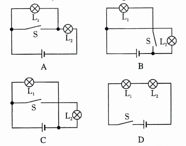 选项D:图中开关$S$在干路上,干路开关控制整个电路,所以开关$S$控制的是灯$L_1$和$L_2$,不符合题意。