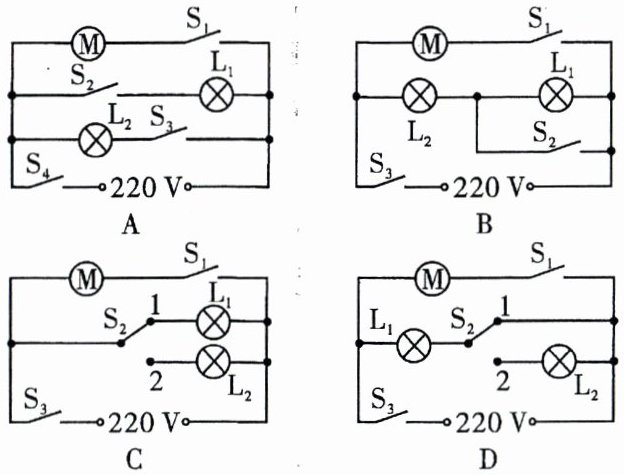 但$S_2$接$1$时$L_1$工作,$S_2$接$2$时$L_1$和$L_2$都工作,不符合“照明灯$L_1$和采暖灯$L_2$不能同时工作”的条件,所以D选项错误。