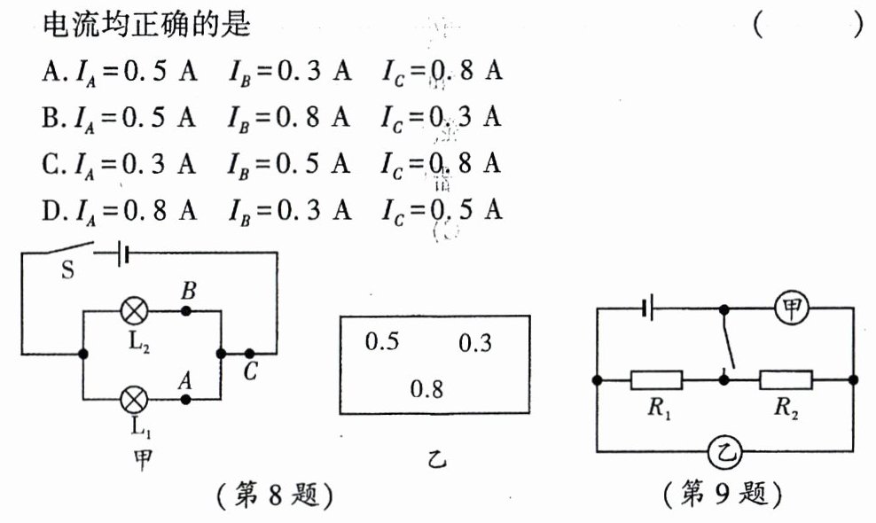 8. 如图甲所示是夏雪同学探究并联电路的电流规律时使用的电路图。实验中她用电流表分别测出A、B、C三处的电流I_A、I_B、I_C,夏雪没有及时将数据整理到相应表格中,而是随手记录到了草纸上如图乙所示。已知$L_1$的电流小于$L_2$的电流。下列选项中三处电流均正确的是(