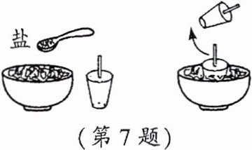 7. 如图所示,将冰块放于单层的不锈钢盆中,并加入适量的盐,用筷子搅拌大约半分钟,盆中冰与盐水混合物的温度低于0℃。将装有西瓜汁的小塑料杯放在盆中的冰块里,几分钟后西瓜汁变成了水果冰棍,这时观察到盆外壁出现白霜。下列说法正确的是 (