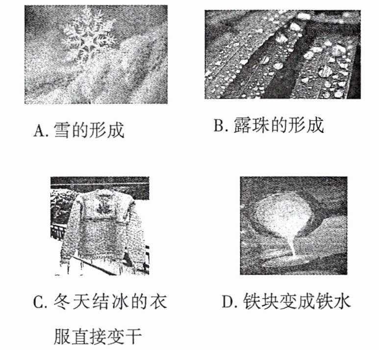 D.铁块变成铁水是固态变为液态,属于熔化,不符合题意。