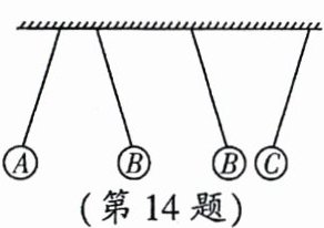 14. 如图,已知A球带正电,从图中所示现象可知B、C两球带电情况:B球