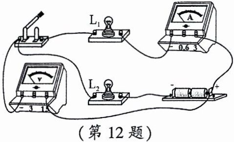 12. 如图所示是雯雯同学研究串联电路中电流、电压特点的实物连接图,当开关闭合时,灯$L_1$亮$,L_2$不亮,电流表和电压表均有读数,则故障原因可能是(