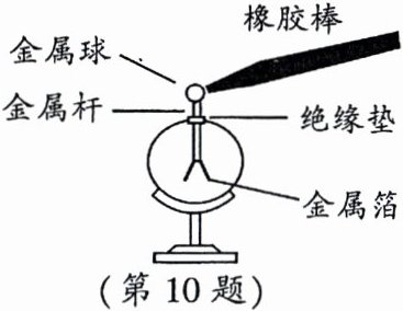 10. 用毛皮摩擦过的橡胶棒去接触不带电的验电器时,验电器的两片金属箔张开,如图所示,下列说法正确的是(