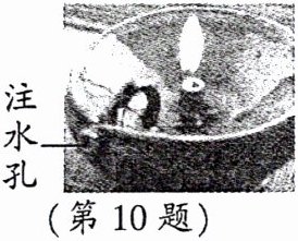 10. (2024·苏州)据记载,唐朝时省油灯已在四川地区出现。瓷质灯体如碗状,腹部有中空夹层,可通过注水孔向夹层装水,碗内有油和灯芯,如图所示。燃灯前,向注水孔缓慢注入冷水,让