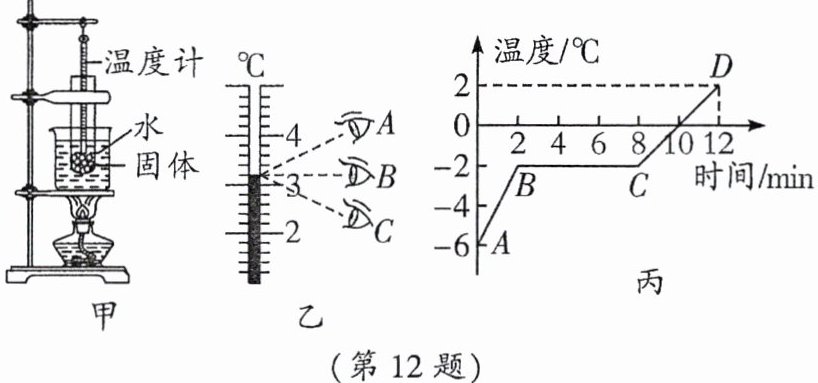 (3)他改正了错误的读数方法后,继续进行实验,并根据所记录的实验数据描绘出该物质的温度随时间变化的关系图像如图丙所示。第6 min时,该物质处于