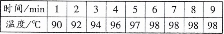 (2)从表格数据可以看出,水在沸腾前,吸收热量,温度不断升高;水在沸腾过程中,吸收热量,温度保持不变,水的沸点是$98^{\circ}C$。因为$1$个标准大气压下水的沸点是$100^{\circ}C$,液体的沸点随气压的降低而降低,所以此时当地的大气压低于$1$个标准大气压。