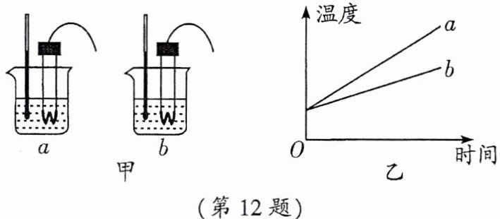 12. (2024·湖北)如图甲,利用相同规格的加热器加热等质量的a、b两种液体,得到温度随时间变化的图像如图乙,分析可知(