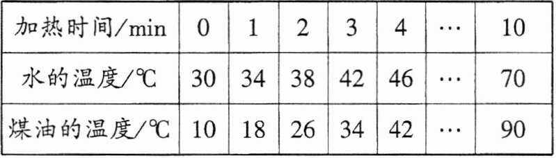 (选填“水”或“煤油”)的吸热能力更强。|加热时间/min|0|1|2|3|4|…|10|