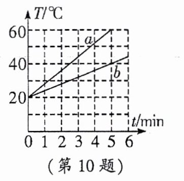 10. (2024·烟台)在探究“物质的吸热能力与哪些因素有关”的实验中,用质量是0.3kg的水和表中等质量的另一种物质进行对比,作出的图像如图所示。实验过程中,水和另一种物质在相同时间内吸收的热量相等,分析图像可以得出图线______(选填“a”或“b”)对应的物质为水,另一种物质为______,这种物质在0~5min内吸收的热量为______J。