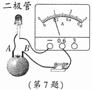 7. 利用水果可以制作电池。小丽同学自制的橘子电池与电流表连接后,闭合开关,电流表的指针偏转情况如图所示,则该橘子电池的