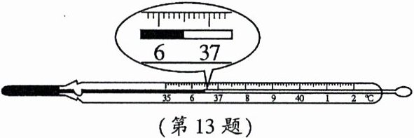 本题主要考查体温计的工作原理和读数方法,这是物理学中热学部分的基础知识。首先,体温计是根据水银的热胀冷缩性质制成的,这是温度计的基本原理。其次,对于体温计的读数,需要观察液柱的位置,并根据体温计的分度值来确定温度值。在本题中,体温计的分度值为$0.1℃$,液柱对应的刻度在$36℃$和$37℃$之间,且更靠近$37℃$,因此可以读出体温计的示数为$36.5℃$。