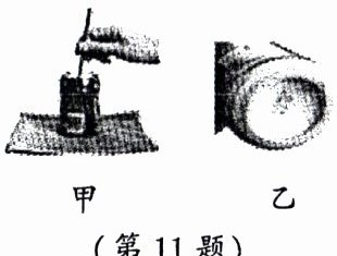 11. 如图甲所示,小明将冰块放入易拉罐中加盐。用筷子搅拌大约半分钟,用温度计测量罐中冰和盐水混合物的温度,可以看到混合物的温度低于0 ℃。这时他观察到易拉罐下部和底部有白霜(如图乙所示)。关于该现象的说法正确的是(