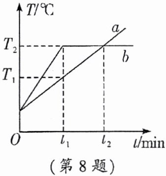 8. (2024·东营)取质量相同、初温相同的两种物质的粉末状样品a和b,用完全相同的加热装置同时对a、b加热,它们的温度随加热时间变化的图像如图所示。由图可知,物质a的比热容
