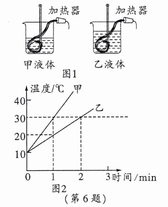 6. 如图1所示,用相同的电加热器给初温及质量均相同的甲、乙两种不同的液体加热,两种液体每秒吸收的热量相同,两种液体的温度-加热时间的图像如图2所示,则(