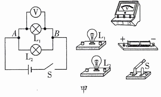 (1) 观察图甲,电路图显示两个灯泡并联,电压表并联在$L_1$两端,实物图应与电路图对应。