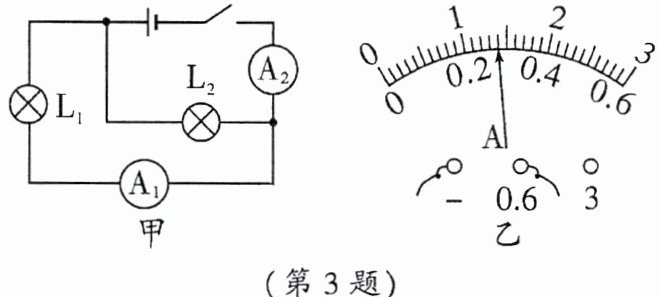 3.(2025·西附)如图甲所示的电路中两电流表均接入小量程,闭合开关S后,电流表$A_1$的示数如图乙所示,电流表$A_2$的示数为0.56 A,下列说法正确的是 (