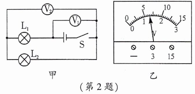 2. 如图所示,当甲电路中的开关S闭合时,两个电压表的指针位置均为如图乙所示,则$L_2$两端的电压为