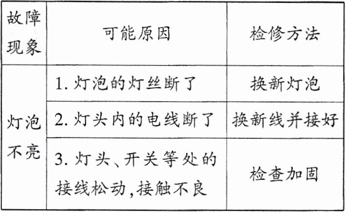 | 灯泡不亮 | 1. 灯泡的灯丝断了2. 灯头内的电线断了3. 灯头、开关等处的接线松动,接触不良 | 换新灯泡换新线并接好检查加固 |