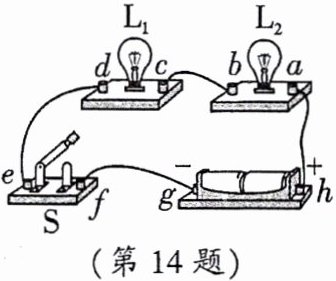 14. 如图所示电路,闭合开关S,灯泡$L_1、$$L_2$都发光。现将一根导线接在该电路中的某两个接线柱上,会导致两灯同时熄灭的是(