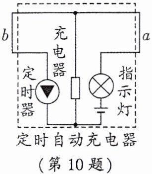 10. 如图所示是小华设计的定时充电电路。充电器充电3小时后,定时器中会有电流通过,充电器将停止充电,其原理是定时器相当于一个定时的