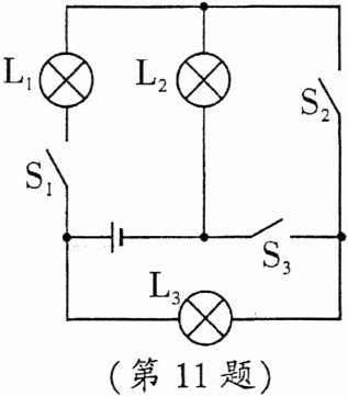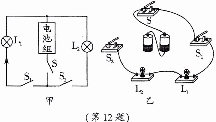 12. 现用灯$L_1、$$L_2,$三个开关S、$S_1、$$S_2,$一个电池组及导线若干组装电路,按要求设计的电路图如图甲所示。