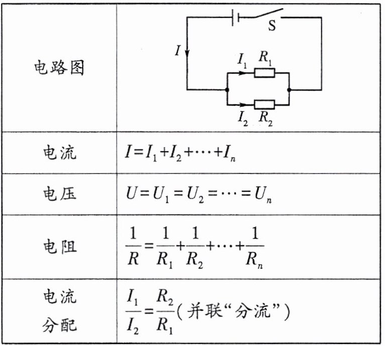 |电阻|$\frac{1}{R}= \frac{1}{R_{1}}+\frac{1}{R_{2}}+…+\frac{1}{R_{n}}$|