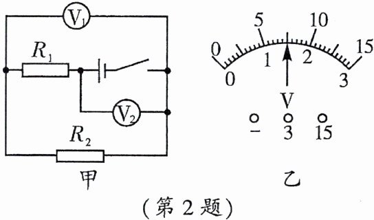 2. 如图甲所示电路中,当闭合开关后两只电压表的指针偏转均如图乙所示,则$R_{1}$两端的电压是
