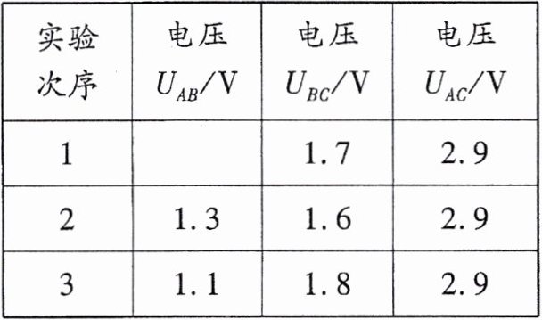 V。接着更换不同规格的灯泡并多次实验,数据记录见表。| 实验次序 | $U_{AB}/V$ | $U_{BC}/V$ | $U_{AC}/V$ |