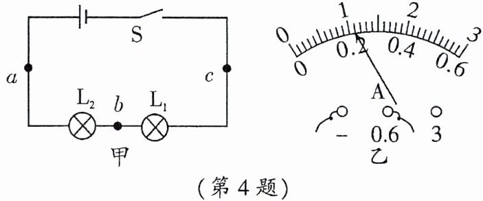 4. 在“探究串联电路的电流特点”的实验中,小红同学选用两个不同的小灯泡组成了如图甲所示的串联电路,然后用一个电流表分别接在a、b、c三处去测量电流。