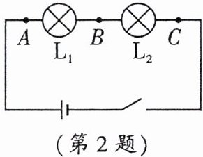 2. 如图所示,在探究“串联电路中电压的规律”时,小芸同学用电压表测出AB、BC、AC两端的电压分别为$U_{AB}= 3\ V$,$U_{BC}= 3\ V$,$U_{AC}= 6\ V$,在表格中记录数据后,下一步应该做的是(