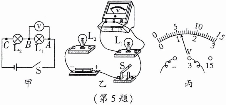 (3)用电压表分别测出电压$U_{AB}$、$U_{BC}和U_{AC}$。其中测$U_{AB}$时,电压表的示数如图丙所示,示数为