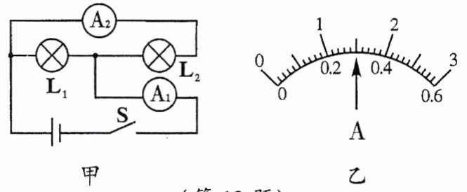 13. 如图甲所示的电路中,闭合开关,两灯泡均发光,且两个完全相同的电流表指针偏转均如图乙所示,则通过灯泡$L_1$和$L_2$的电流分别为(