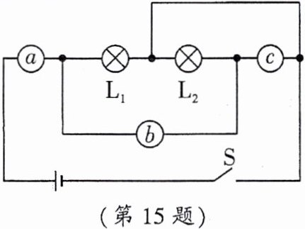 15. (2025·一中)如图所示$,L_1$和$L_2$两个灯泡并联,a、b、c三个电表(可能是电流表或电压表)的示数依次为1.5、1.0、2.0(单位为A或V),则灯泡$L_1$两端的电压为