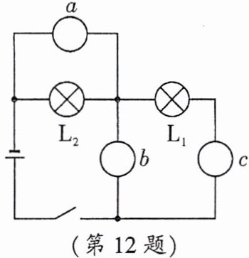 12. 如图所示的电路中,a、b、c三处表示电流表或电压表。闭合开关后,两盏白炽灯都正常发光。下列说法正确的是(