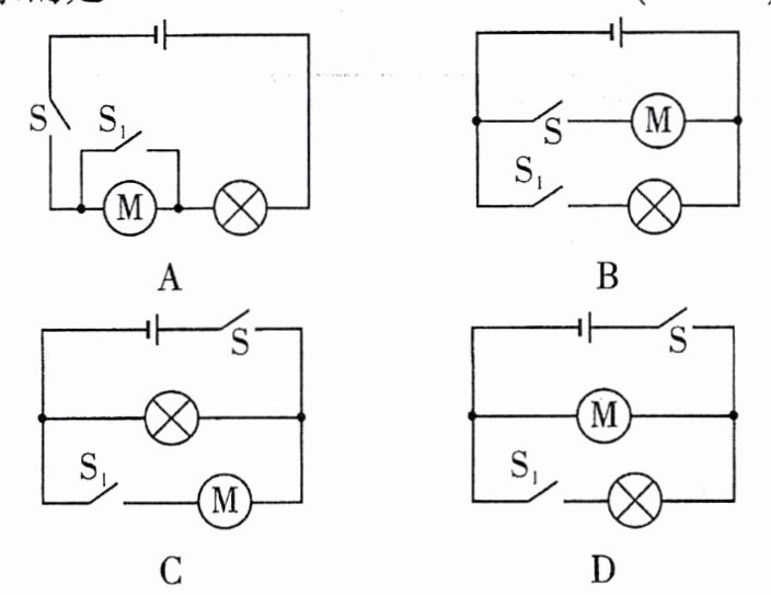 A. 串联电路,S闭合时灯亮、电机不工作,S₁闭合后电机与灯串联,不符合独立工作要求。