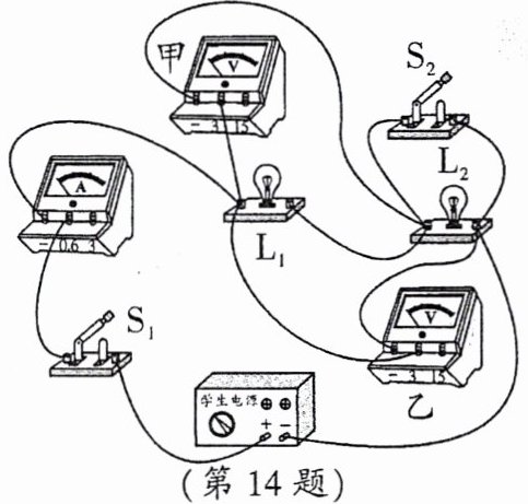 14. 小明连接了如图所示的实物图,若要使电路中的灯$L_1$与$L_2$串联,开关$S_1$闭合,开关$S_2$
