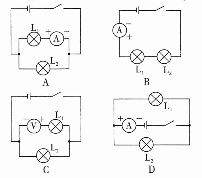 11. 如图所示,能够直接正确测出通过灯$L_1$电流的电路是(