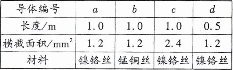 (4)探究导体电阻大小与导体横截面积的关系,需要控制导体的材料和长度相同,横截面积不同。从表格中可以看出,导体b和c的材料分别是锰铜丝和镍铬丝,材料不同,长度都是$1.0m$,横截面积分别是$1.2mm^2$和$2.4mm^2$,所以不能探究导体电阻大小与导体横截面积的关系。