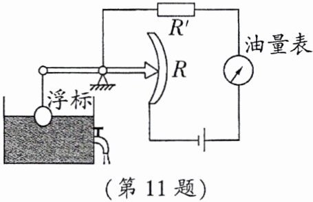 11.如图是一种自动测定油箱内油面高度的装置,R'是定值电阻,R是滑动变阻器,它的金属滑片是杠杆的一端,从油量表指针所指的刻度就可以知道油面的高度。