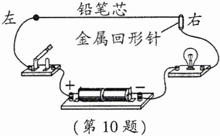 (2)金属回形针向左移,铅笔芯接入电路的长度减小,电阻减小,根据欧姆定律$I=\frac{U}{R}$,电源电压不变,电阻减小,电流增大,小灯泡亮度变亮。